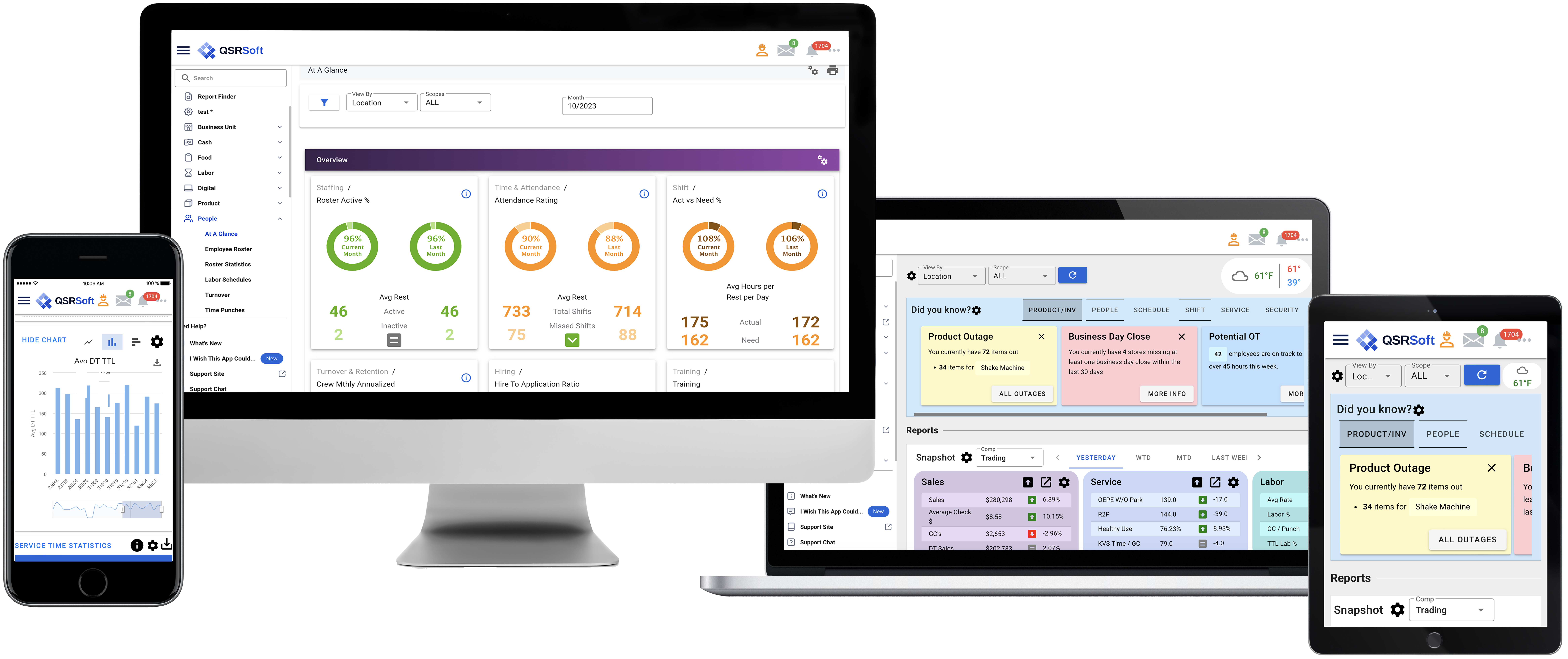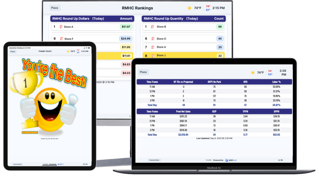 Everyone needs a little motivation at work sometimes. Bring in your own leaderboard with QSRSoft TV, a product that connects, recognizes, and manages your workforce. If you are ready to revolutionize your operations, increase employee satisfaction, retention and much more — put the spotlight on your team with QSRSoft TV.